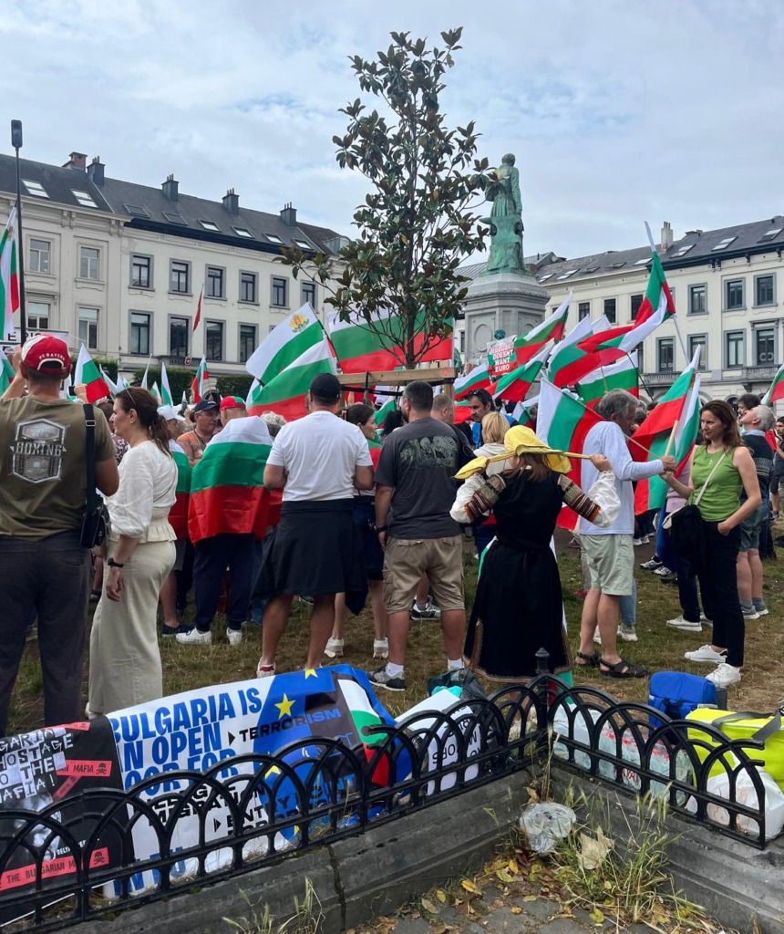 Avrupa Parlamentosu önünde toplanan protestocular, Bulgaristan bayrağı açarak, bir bildiri yayımlayarak, sloganlar eşliğinde