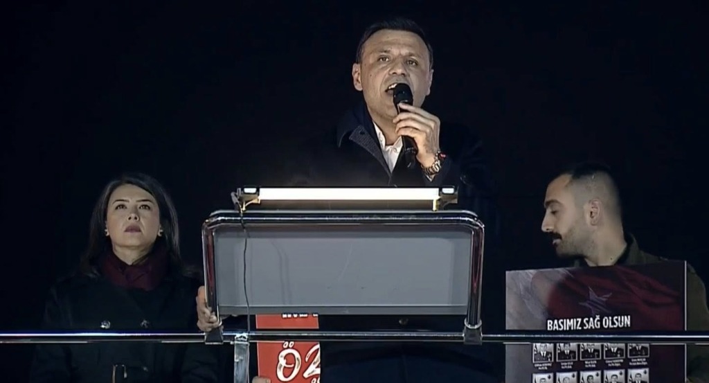 CHP lideri Özgür Özel, Sultanbeyli’deki mitingde, CHP Arnavutköy İlçe Başkanı Ekin Aras’ı sahneye çağırarak Gürcistan-Azerbaycan sınırında düşen kargo uçağında şehit olan 20 asker için dua okuttu.