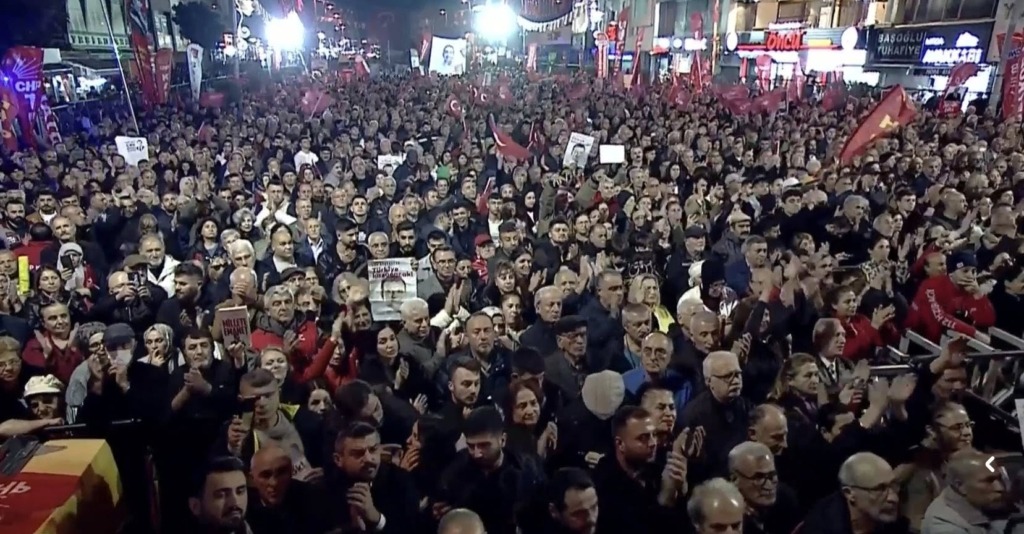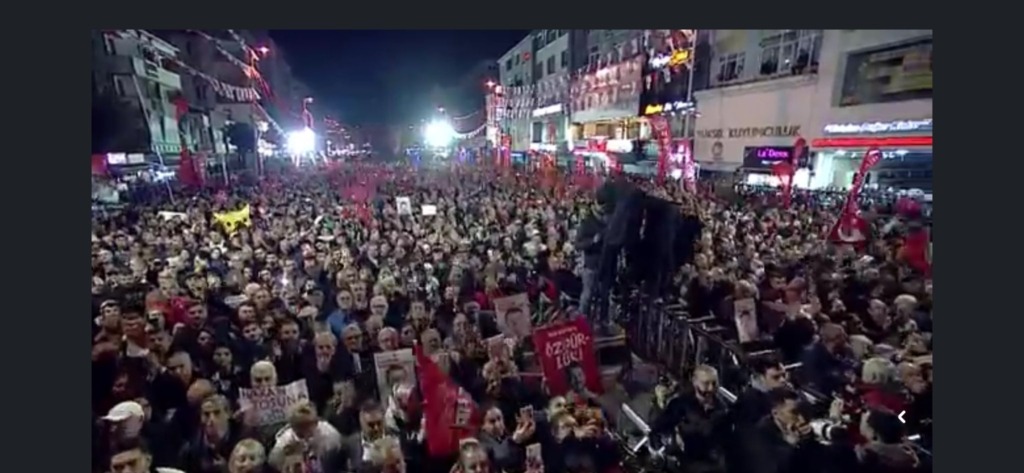 Saat 19.30’da Kent Meydanı’nda başlayan büyük buluşmada, on binlerce vatandaşa seslenen Özel CHP’yi kapatma iddialarına sert yanıt verdi. Özel, ‘Parti kapatmak darbecilerin işi değil midir? Recep Tayyip Erdoğan havlu atmış bir siyasetçidir. Bu millete zorla kendini dayatmaktadır. Bütün demokratlara sesleniyorum. Vakit demokratik siyaseti beraber savunmaktır’ dedi.
