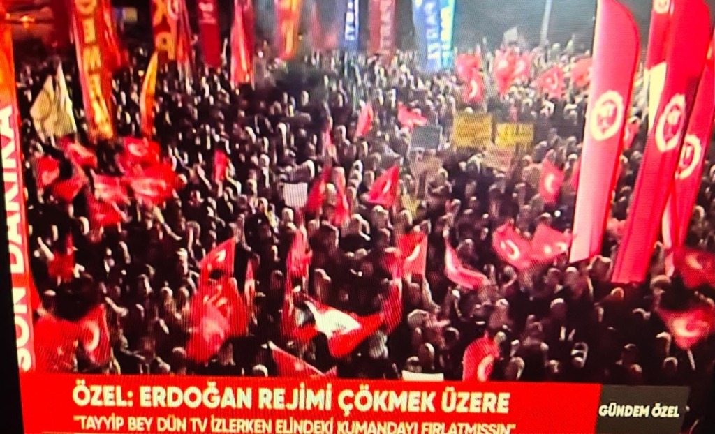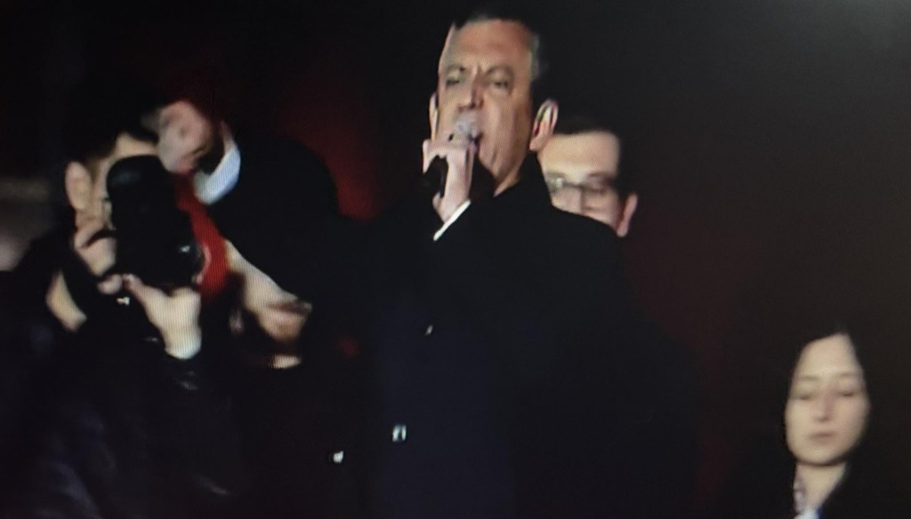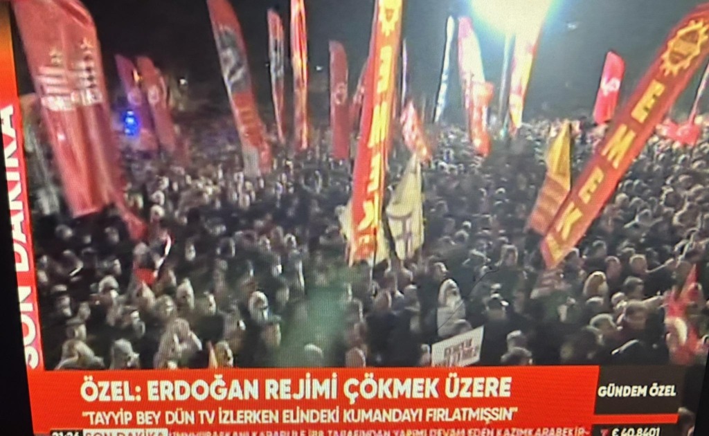 Bizi şu anda Türkiye’nin tüm televizyonlarının yanında tabii bunu destekleyenler canlı yayında, köstekleyenler yarın manipülasyon yapmak için dört gözle bizi izliyor. Ancak dünyanın bütün televizyonları, ajansları burada izlerken, biz içindeyiz. Ne kadar görüyorsunuz bilmiyoruz ama dünya ve Türkiye görüyor ki Tayyip Erdoğan’ın istibdat, baskı, yasak rejimi sallanmaktadır, çökmek üzeredir. Ey Tayyip Erdoğan, 19 Mart darbesine kalkıştığın sabah beş gün süreyle İstanbul’da eylem yapmayı, yürüyüş yapmayı yasaklamış, ‘kalkışanlar dağıtılacak’ demiştin… Tayyip Bey, ilk gece bu meydanda 120 bin kişi vardı. ‘Yarına yok’ dedin, dün gece bu meydanda 160 bin kişi vardı. Dün televizyonu izlerken elindeki kumandayı kırmışsın, yere atmışsın. O sırada ben 21 il 14 büyükşehir ve tüm Türkiye’de örgütümüzü belediyelerimizi eyleme davet ederken, demişsin ki ‘İstanbul başta olmak üzere yarın akşam Özgür Özel’in çağrısıyla Saraçhane’de ve herhangi bir şehirde bir kalabalık toplanır eylem olursa o valiyi o emniyet müdürünü görevden alacağım’ demişsin. Anadolu’yu tehdit ettin, bugün hiçbir ilde eylem olmayacak dedin, Tayyip Bey bak bugün burada 210 bin kişiyiz. Sayın Erdoğan, İçişleri Bakanı telefonunu bekliyor, İstanbul Valisi’ni İstanbul Emniyet Müdürü’nü görevden almazsan hatırım kalır! Ama performans ölçün buysa ne valine ne emniyet müdürüne kıyma. Çünkü değil yenileri, kendin gelsen İstanbul’a vali olsan yine toplanacağız. Ant olsun ki Saraçhane bizimdir, Vatan Emniyet bizimdir, Çağlayan bizimdir, Taksim bizimdir.