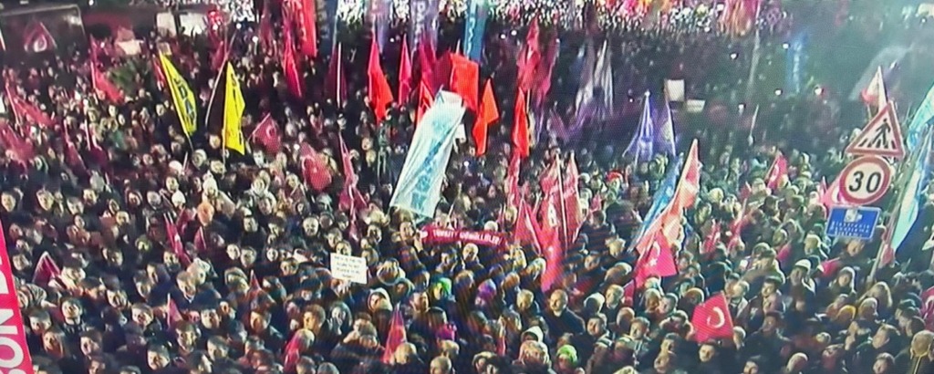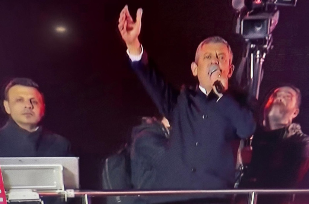CHP Genel Başkanı Özgür Özel,” Ne kadar kalabalıksınız.. Ekrem İmamoğlu ve iradenize sahip çıkmak için buradasınız.. Özgür Özel ne diyecek önemli değil..Bu gece Özgür Özel konuşuyor.. Ey Erdoğan, halk sana sesleniyor.. Dünden beri Demokrasi tarihimizin en kara günü yaşandıkça, kararlılıkla birliktelik yapan Cumhur İttifakı hariç, bu millete yalan söylemeyen, bizimle birlikte olan siyasi partilerin lider ve temsilcileri ve tüm siyasi partilerin temsilcilerinin burada gösterdikleri dayanışma ve Ekrem İmamoğlu adına, Ailesi adına, İstanbul adına teşekkür ediyorum..